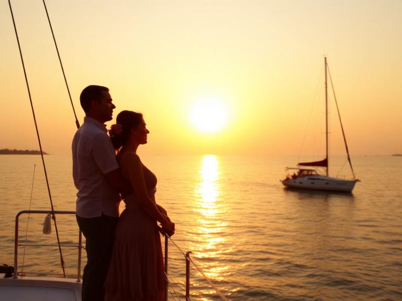 Romantic sunset cruises with champagne and gourmet dining as the sun sets over the Arabian Sea.